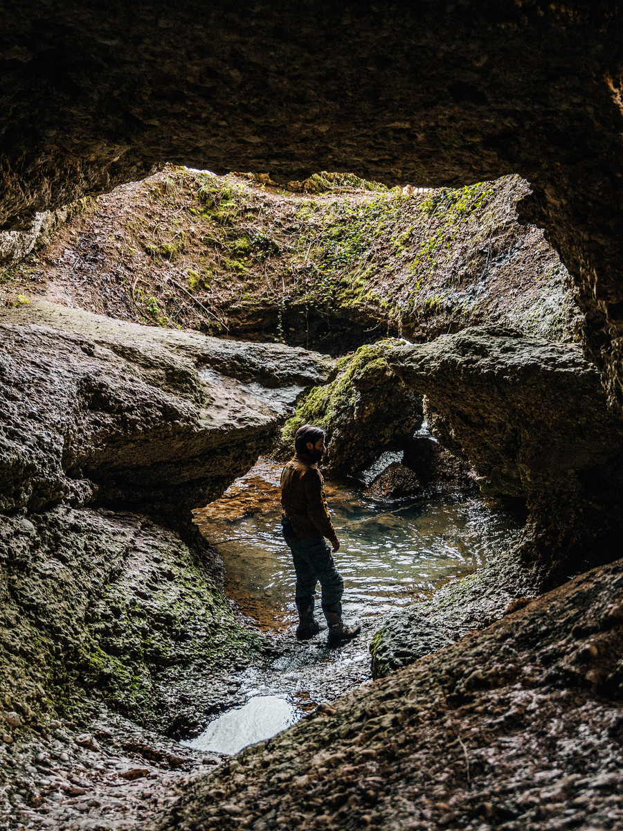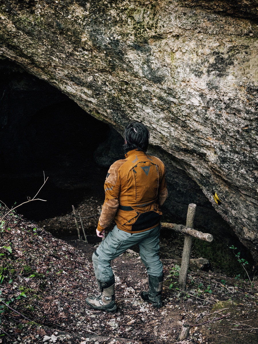 やがてタヴァラン・グランド洞窟に到着します。森の中心にぽっかりと開いたその自然洞窟は、まるで別世界への入口のようです。エンジンを切り、道端にバイクを停め、植生の中の小道を歩きます。第一次世界大戦中、イタリア兵たちがここに身を潜めていました。戦争の痕跡は、今も深く刻まれています。