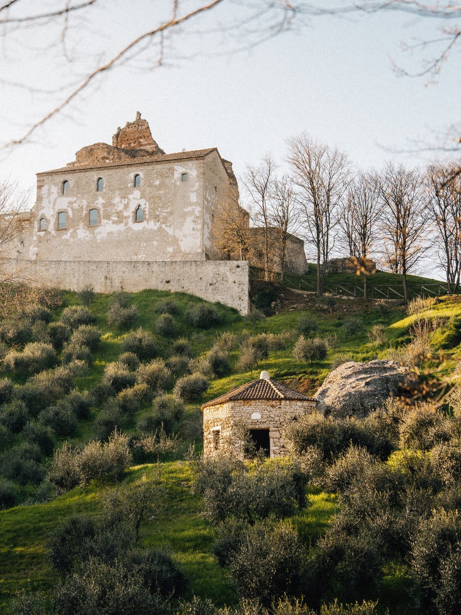 路面は変化し、砂質になり、荒れ、雨に削られています。サンテウスタキオ修道院跡の近くにバイクを停めます。時間に取り残されたようなこの場所では、石が修道士や巡礼者、そして兵士たちの物語を語りかけてきます。