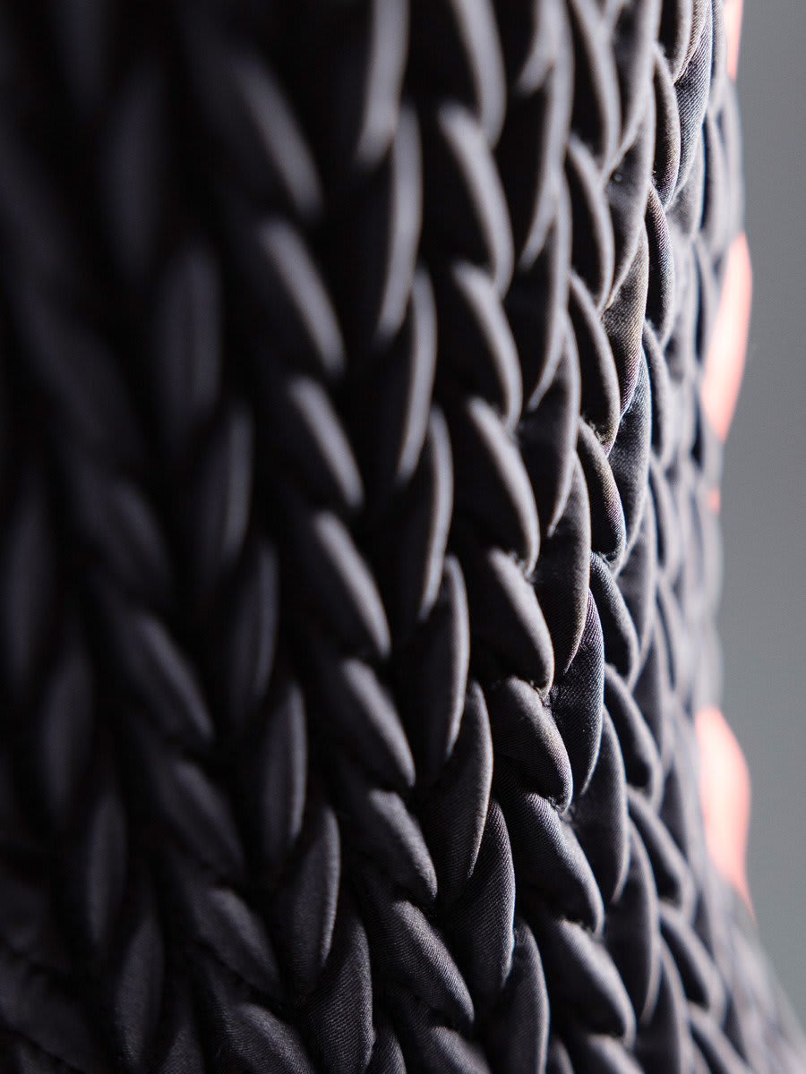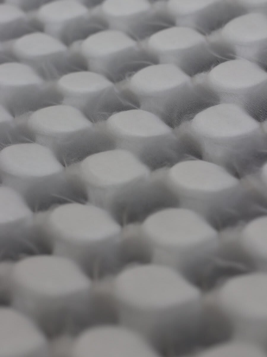 撥水性を持つ合成繊維は速乾性に優れ、湿気がある状態でも断熱性能を維持します。ドーム状構造とソリッドエリアを交互に配置した独自構造により、空気を制御された形で閉じ込め、通気性、圧縮性、軽量性を最適化しながら、使用する素材量を最小限に抑えています。