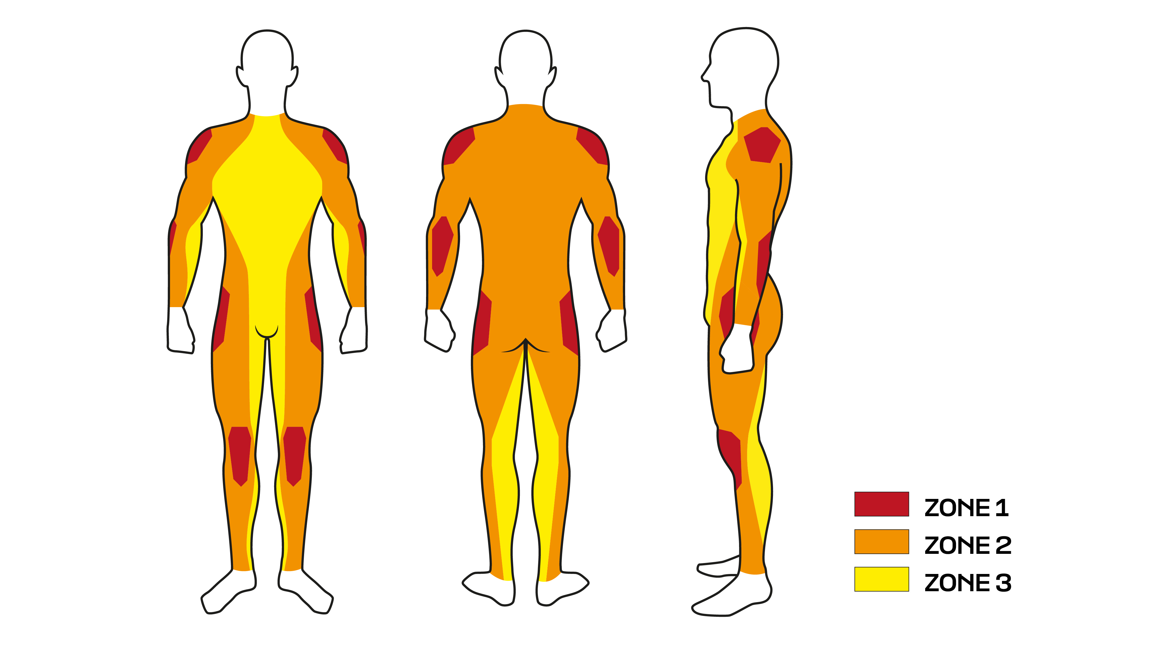 ゾーン1は最も露出度が高く、従来から硬いプロテクターで覆われている部分で、肩、肘、腰、膝が含まれます。ゾーン2は腕、背中、臀部、脚の外側が含まれます。
