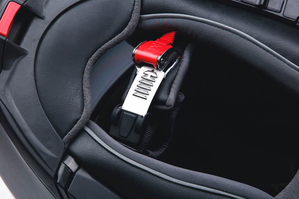 ヘルメットの留め具にはストラップが使用されていますが、このストラップは必ず正しく締める必要があります。