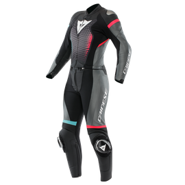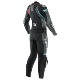女性用の2ピーススーツ。1.2mmの牛革を使用し、ストレッチ素材のインサートとアルミニウムの肩パッド、そしてエアロダイナミックなハンプが特徴です。